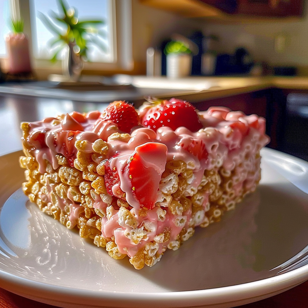 Imagine biting into a crispy, chewy Rice Krispie Treat, but wait, it gets better. Now, picture that same treat adorned with a vibrant strawberry crunch topping that practically sings summer.