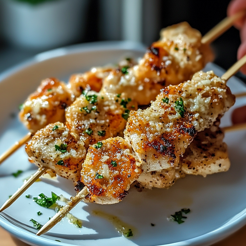 The scent of juicy garlic parmesan chicken skewers sizzling on the grill fills the air with anticipation. The golden-brown bits sparkle under the sun, promising a flavor explosion in every