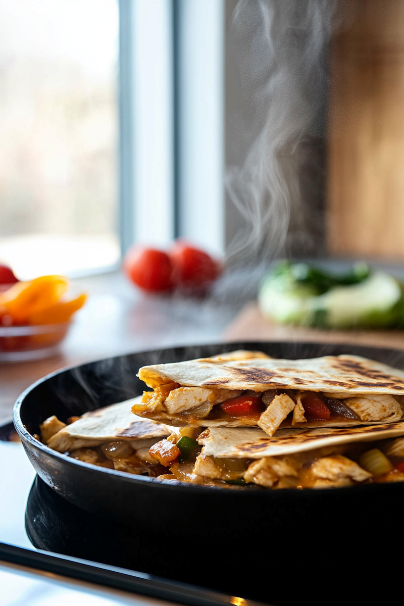 A Mexican-inspired fusion combining crispy tortillas with seasoned chicken, peppers, and melted cheese – perfect for lunch or quick dinner.