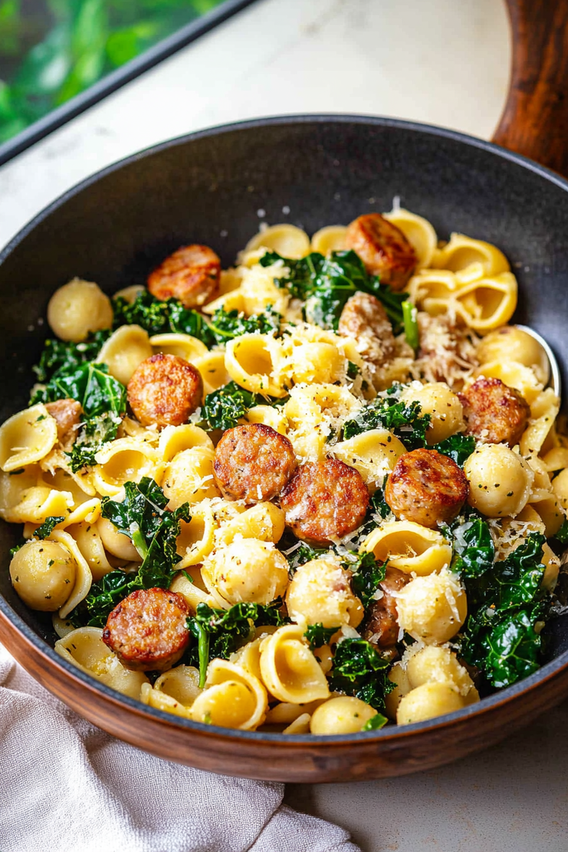 A hearty pasta dish combining Italian sausage, fresh kale, and pasta in a garlic white wine sauce.