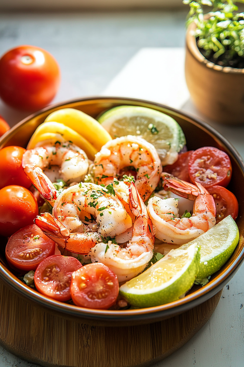 A light and refreshing salad featuring succulent shrimp, juicy tomatoes, and crisp vegetables tossed in a zesty lemon-herb dressing. Perfect for summer lunches or as a healthy dinner option.