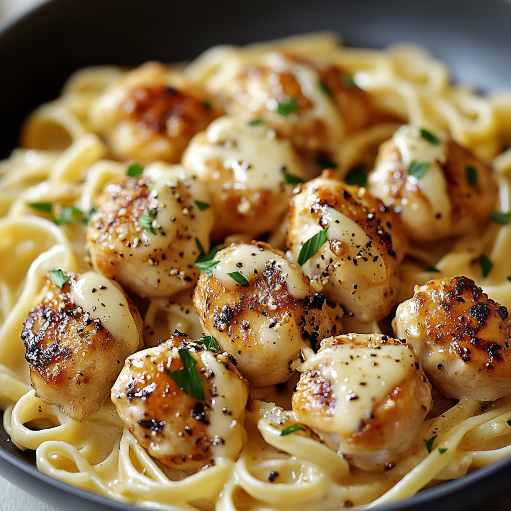 - Garlic Butter Chicken Bites with Creamy Parmesan Pasta transforms dinner into a delight
