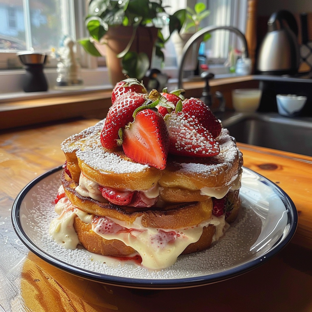Keywords: Feel free to substitute strawberries with blueberries or bananas for a fruity twist. Allow French toast to rest for a few minutes after cooking for better texture. Pair with maple syrup or whipped cream for an extra special treat.