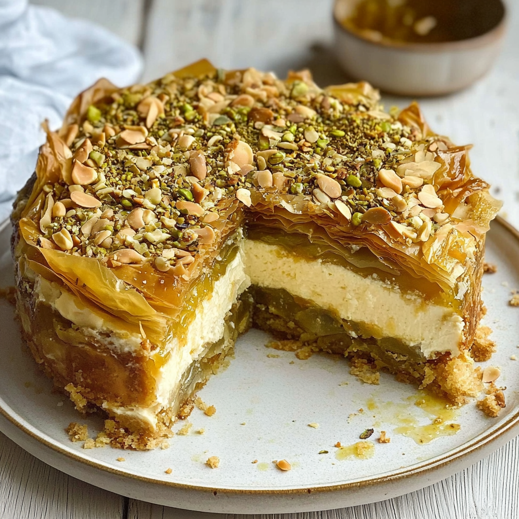 Indulge in the delightful fusion of rich cheesecake and sweet baklava with this Baklava Cheesecake recipe. Each slice features a creamy, luscious filling layered with crunchy nuts and drizzled with honey, creating a mouthwatering dessert sensation. Perfect for any celebration, this easy-to-make cheesecake will impress your guests and leave them asking for seconds!