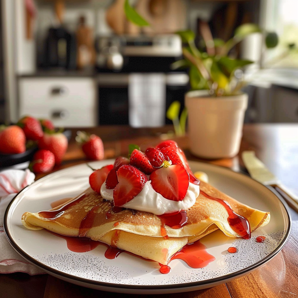 Keywords: Substitute strawberries with bananas or blueberries for a different flavor. Add a splash of vanilla or almond extract to the batter for an extra twist. Store leftover crepes in an airtight container in the fridge for up to three days. Reheat gently in a skillet.